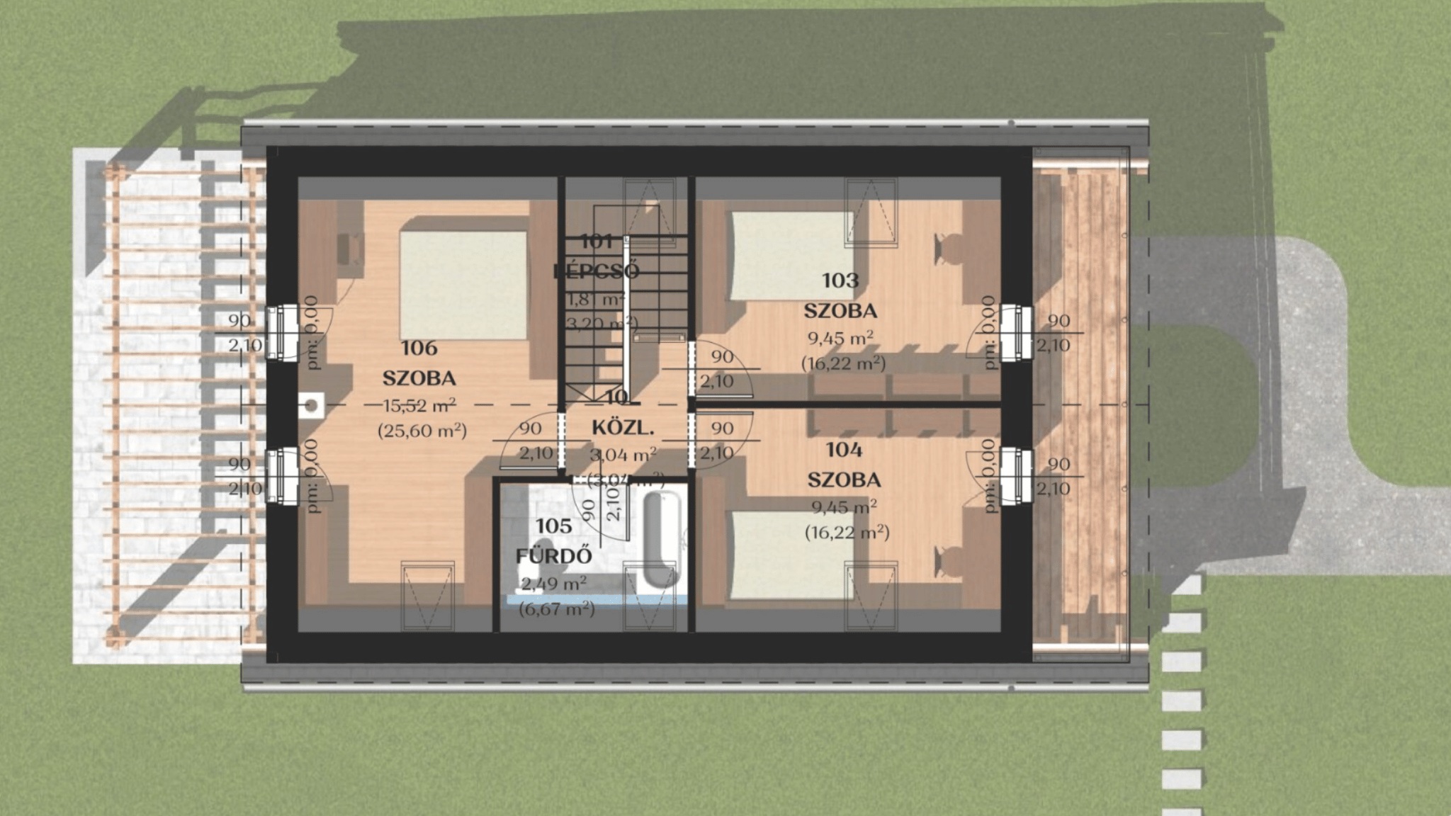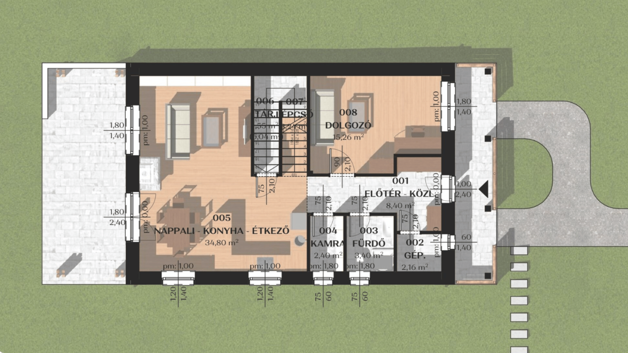 Bár típusházról beszélünk, az sosem egy „egy az egyben” megoldás. Minden egyes telek más, ezért a választott típusház terveit hozzáigazítjuk a konkrét telek sajátosságaihoz. Ez magában foglalhatja a tájolás, a bejáratok elhelyezése, a lejtéshez való igazítás vagy éppen a helyi építési szabályoknak való megfeleltetés kérdését.